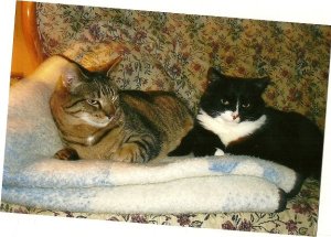 Pearlina Wilhelmina (white cat with black patches); Priscilla (tortoisehell laying across back of chair, her daughter, Emmylou, is the Russian blue tuxedo on the right)